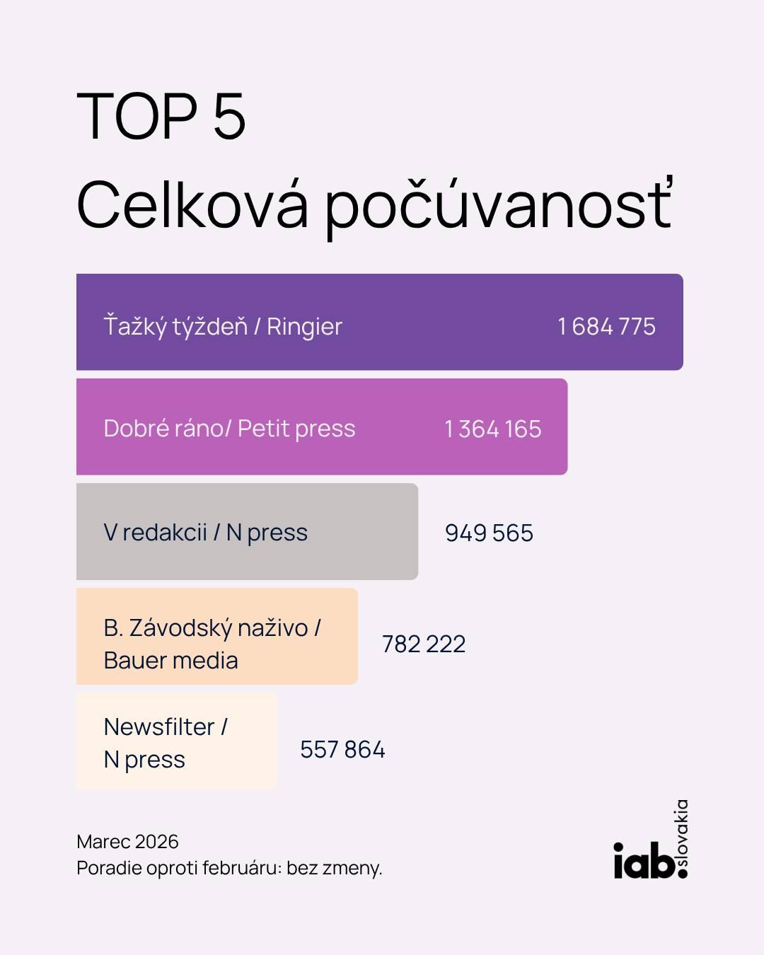 Slovenský podcastový trh v marci 2026 pokračoval v raste: celková počúvanosť dosiahla 13,8 milióna vypočutí, čo je o 5 % viac ako vo februári. Vyplýva to z pravidelného report z monitoring IAB Slovakia, ktorý monitoruje 132 podcastov od 8 vydavateľov. TOP 5 zostalo stabilné: Ťažký týždeň (1,68M), Dobré ráno (1,36M), V redakcii (950K), Braňo Závodský naživo (782K), Newsfilter (558K). Celá správa a report na stiahnutie TU.